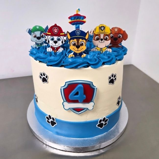 Flot kage til de små Paw Patrol-fans. Kagen er smurt op med smørcreme og pyntet med sukkerprint og fondant. Vælg selv bunde og mousser – og tilføj en personlig tekst på toppen. Perfekt til børnefødselsdagen.