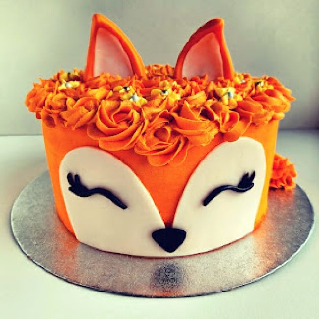 Sød og charmerende rævekage dekoreret med smørcreme og fondant – perfekt til både børnefødselsdage og dyreelskere.