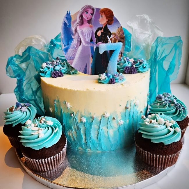 Eventyrlig Frost-kage med smørcreme, isblå detaljer og pynt inspireret af Elsa og Anna – perfekt til små isdronninger og -prinser.