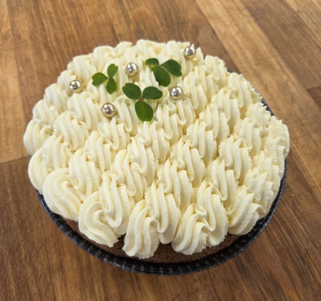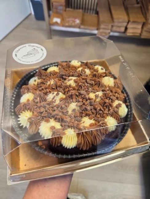 Svampet chokoladekage med karamel, mælkechokoladecreme og hakket Daim